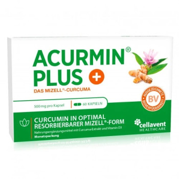 Acurmin Plus ist ein Nahrungsergänzungsmittel mit Curcuma-Extrakt und Vitamin D3. Der Hauptwirkstoff der Mizell Kurkuma Kapseln ist Curcumin. Mizell Kurkuma zeichnet sich durch die maximale Bioverfügbarkeit mit Langzeitversorgung aus. In Studien konnte gezeigt werden, dass Mizell Kurkuma Kapseln im Vergleich zu nativem Kurkuma-Pulver über eine 184-fache Bioverfügbarkeit verfügen. Acurmin Plus erhalten Sie rezeptfrei in der Apotheke.