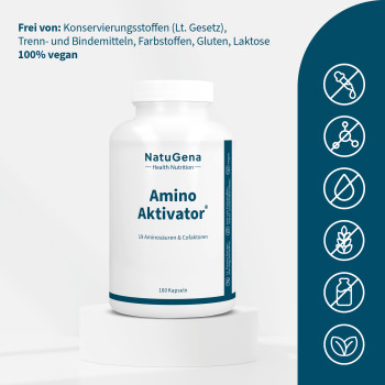 Nahrungsergänzungsmittel mit allen essentiellen, semi-essentiellen und nicht-essentiellen Aminosäuren. Mit den Vitaminen B6, B9, B12.