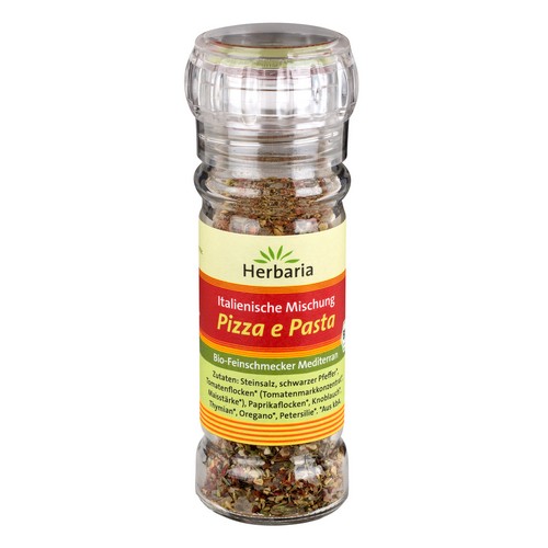 Herbaria Pizza e Pasta ist ein Allround-Gewürz für die italienische Küche. Es ist perfekt für Pizza, italienische Nudelgerichte sowie für Bruschetta und Tomate-Mozzarella. Mit klassischen Kräutern wie Thymian und Oregano sowie fruchtigen Tomaten- und Paprikaflocken ist diese Mischung perfekt für die mediterrane Küche. In der Mühle ideal als Tischgewürz zum Nachwürzen der Gerichte. Einfach direkt und nach Geschmack drübermahlen.