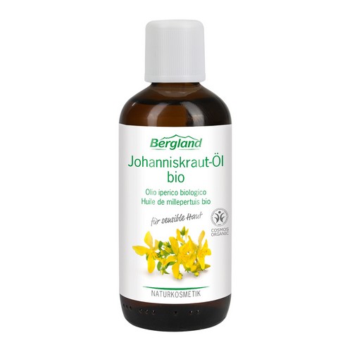 Bergland Bio Johanniskraut-Öl ist ein Mazerat (öliger Auszug) aus Johanniskrautblüten mit Bio-Olivenöl. 100% pflanzliche Zubereitung.