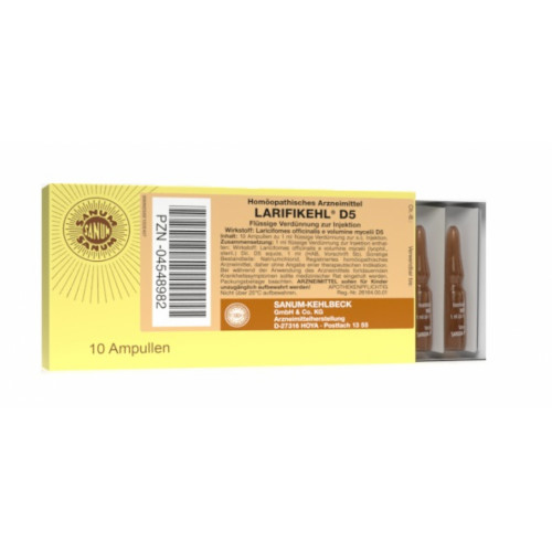Nebenwirkungen: Aufgrund des Gehaltes von Larifikehl® D5 an spezifischen organischen Bestandteilen können in seltenen Fällen Überempfindlichkeitsreaktionen, hauptsächlich in Form von Hautreaktionen, auftreten und eine Allergie gegen den Bestandteil Laricifomes officinalis ausgelöst werden. Das Arzneimittel ist dann abzusetzen und ein Arzt aufzusuchen.