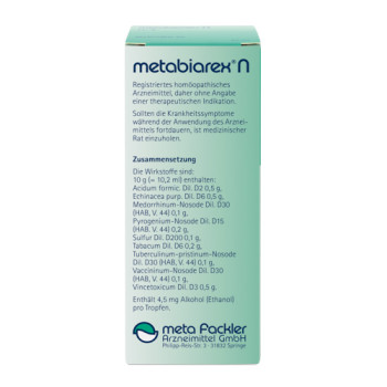 Zur Dosierung, Dauer und Anwendung befragen Sie bitte Ihren homöopathisch erfahrenen Therapeuten. Wegen des Säuregehaltes soll metabiarex N nicht unverdünnt, sondern immer mit etwas Flüssigkeit eingenommen werden.