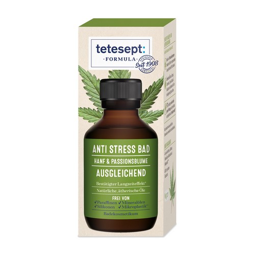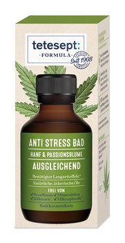 tetesept Anti Stress Bad mit wertvollem Hanf- und Passionsblumenextrakt sowie natürlichen ätherischen Ölen aus Zedernholz, Orange, Litsea Cubeba & Eukalyptus.